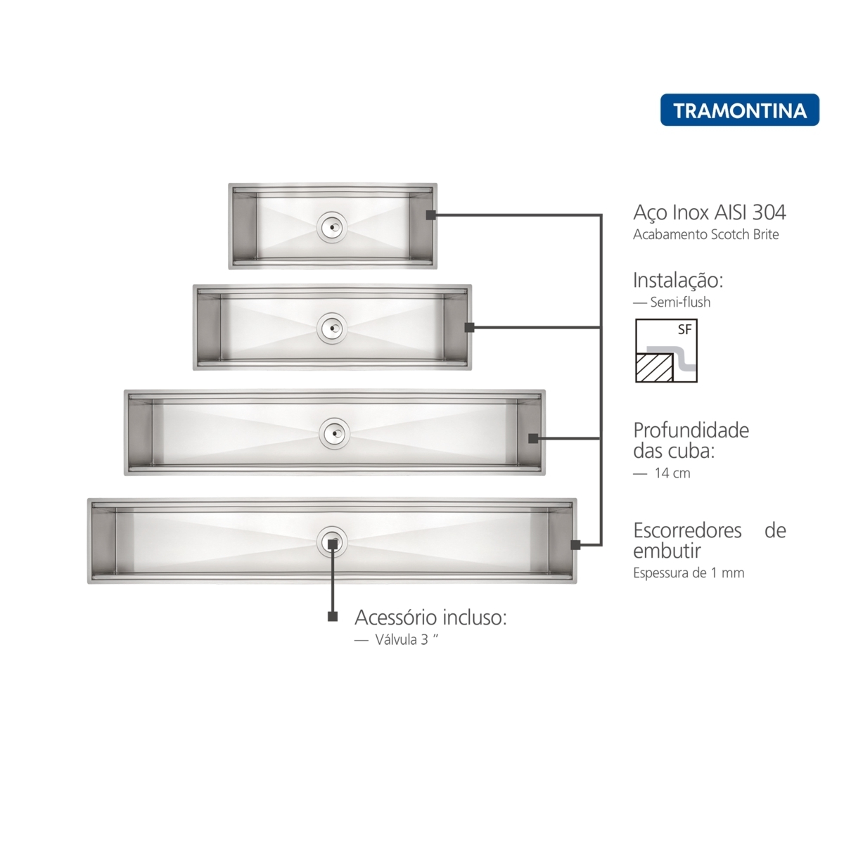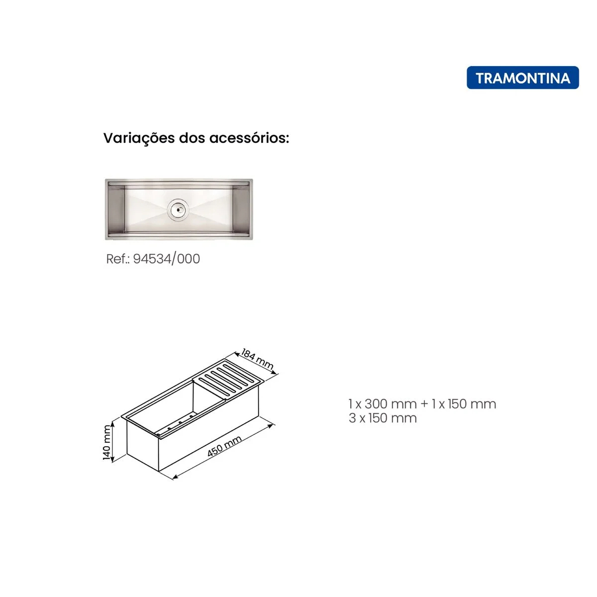 O Canal Organizador vai completar sua cozinha ou espaço gourmet. O Canal Organizador Tramontina para Sobrepor 45×18 cm foi desenvolvido em aço inox 304 com acabamento Scotch Brite com 1 mm de espessura para sobrepor em bancadas, trazendo praticidade e sofisticação para seu projeto, um item fundamental em qualquer cozinha moderna. Devido ao seu tamanho de 45 cm pode ser instalado de uma forma vertical ao lado da cuba. Utilizado para escorrer louças ou alimentos, irá coletar toda água dos escorredores auxiliares e escoará diretamente pela válvula no centro da peça, a qual poderá ter a saída compartilhado com o sifão (não incluso) da cuba ou um ponto exclusivo de esgoto para o escorredor. Além de extremo requinte o Canal Organizador é versátil e possui diferentes tamanhos e diversos acessórios opcionais como escorredor de pratos, porta-talheres, escorredores rasos ou profundos de 15 ou 30 cm de comprimento (acessórios não inclusos).