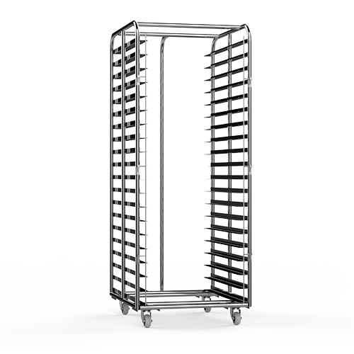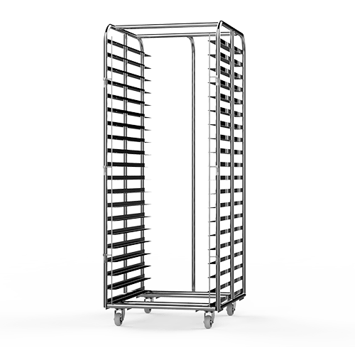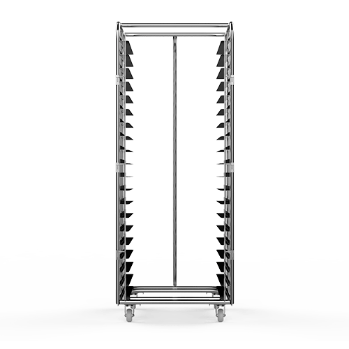Carro em inox que comporta 20 bandejas de 60x80cm e facilita o carregamento do equipamento. Ideal para a utilização em ultracongeladores e fermentadoras industriais.