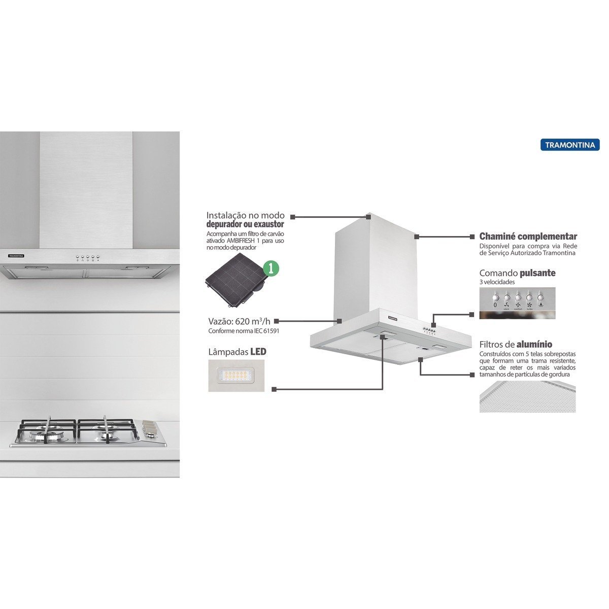 Verifique se a tensão de alimentação indicada na etiqueta de identificação do produto localizada na parte interna da coifa, é a mesma da sua residência 127V ou 220V, a coifa não é bivolt. Na função exaustor os vapores e a fumaça provenientes do processo de cozimento entram pela coifa, são filtrados através do filtro metálico onde fica retida a gordura e conduzida para o ambiente externo através de um duto. Na função depurador, os vapores e a fumaça passam pelo filtro metálico onde fica retida a gordura e por um filtro de carvão ativado onde o ar é purificado, retornando para o ambiente livre de odores. Neste caso não é necessário fazer abertura externa para o duto de saída. Em ambas as funções é necessária a limpeza periódica dos filtros metálicos, sendo que na função depurador, o filtro de carvão deve ser substituído e jamais lavados e reutilizados conforme no manual de instruções. Recomenda-se que a instalação da coifa seja feita pela Rede de Serviço Autorizado Tramontina. Instalação por conta do consumidor. Uso doméstico. A coifa deverá ser instalada a uma altura mínima de 650 mm e máxima de 750 mm dos queimadores do cooktop ou fogão. Para mais informações de como deve ser feita a limpeza do produto, consultar o manual de instruções.
