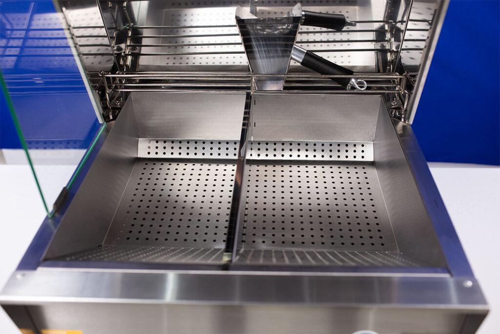 • Projetado para manter tanto batatas fritas quanto outros tipos de alimentos como frango, polenta, mandioca aquecidos e crocantes por um período prolongado;