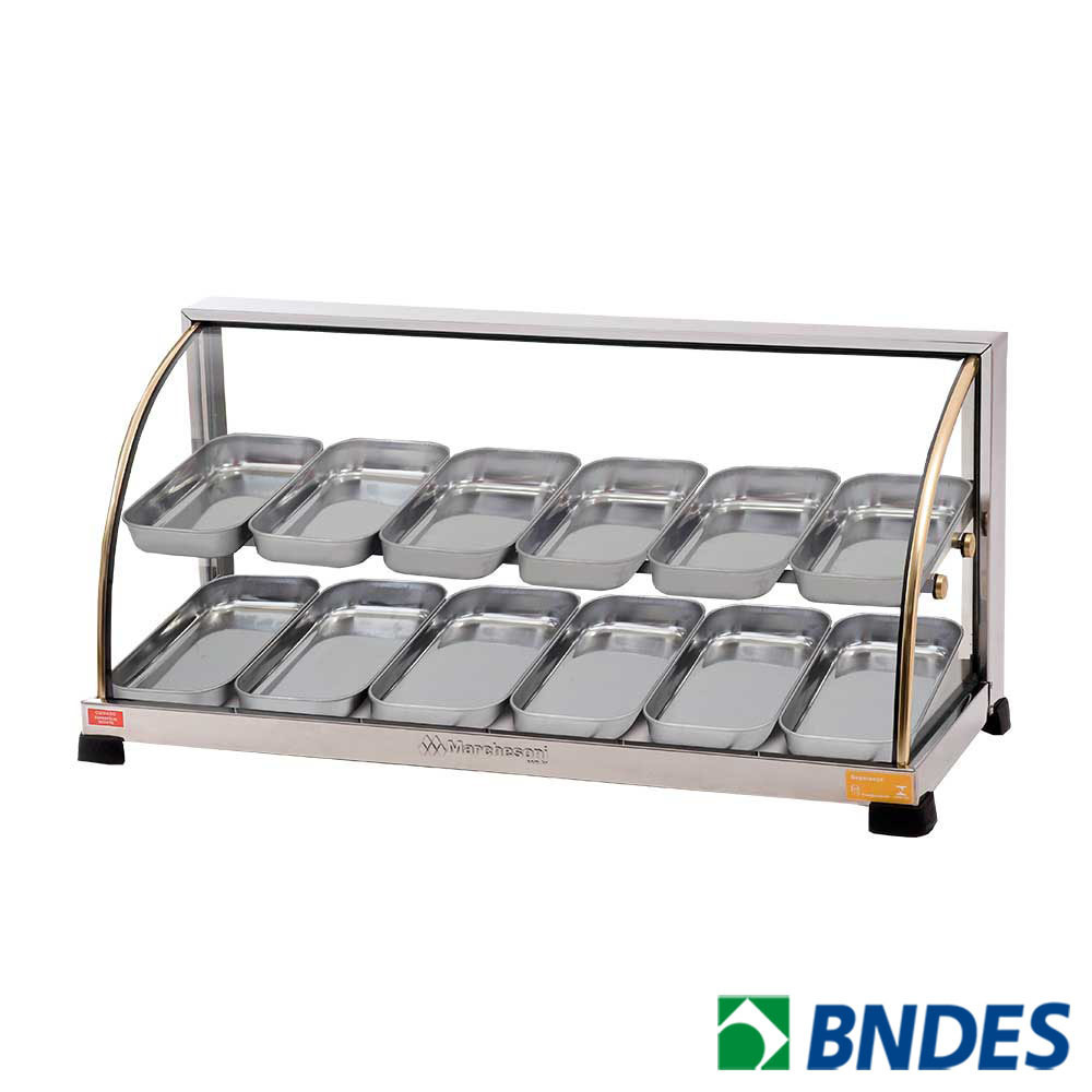 As estufas da linha Ouro Marchesoni destacam-se pelo melhor custo benefício do mercado e são ideais para expor com elegância e manter seus produtos sempre quentinhos. Fabricadas em aço inox, frisos dourados e vidros temperados as Estufas Ouro Marchesoni valorizam a exposição dos seus produtos alavancando suas vendas. Possuem em todos os modelos termostato de temperatura automático, lâmpada piloto indicadora de aquecimento e umidificador que evita o ressecamento dos alimentos.