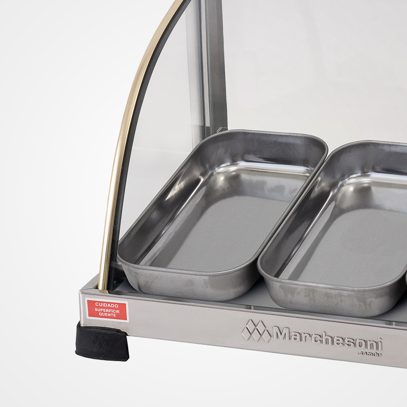 As estufas da linha Ouro Marchesoni destacam-se pelo melhor custo benefício do mercado e são ideais para expor com elegância e manter seus produtos sempre quentinhos. Fabricadas em aço inox, frisos dourados e vidros temperados as Estufas Ouro Marchesoni valorizam a exposição dos seus produtos alavancando suas vendas. Possuem em todos os modelos termostato de temperatura automático, lâmpada piloto indicadora de aquecimento e umidificador que evita o ressecamento dos alimentos.