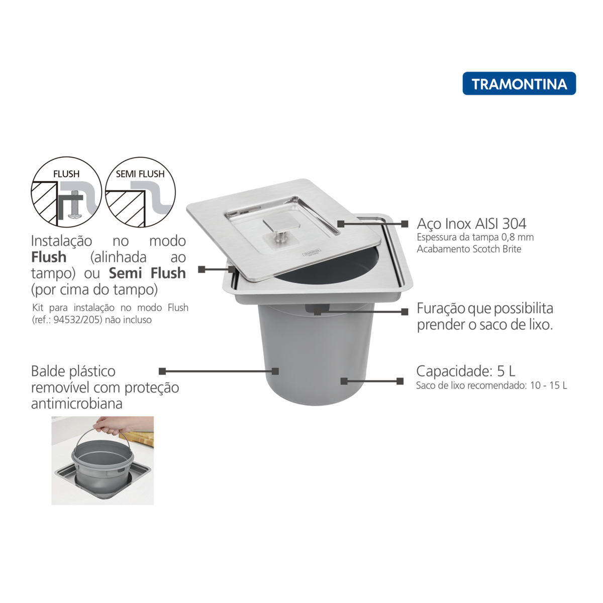 A limpeza e a higiene na cozinha estão diretamente ligados ao bem-estar da sua família. Com a Lixeira de Embutir Tramontina Clean Square em Aço Inox com Balde Plástico 5 L, manter tudo perfeito e limpo em sua casa vai ser muito fácil. Para torná-la indispensável, foi produzida em aço inox, possui balde plástico removível que comporta 5 litros, deixando o ambiente muito mais agradável.