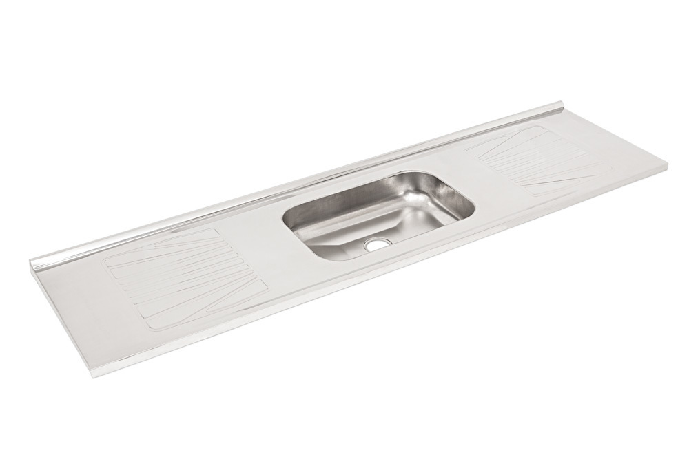 Acabamento: tampo escovado e cuba brilhante;