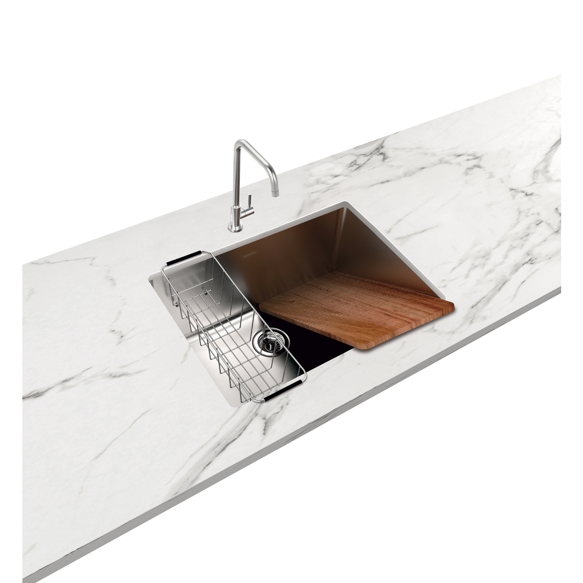 É bem fácil de limpar e é ideal para as casas em que a cozinha é integrada com a área de serviço, já que também pode combinar com a cuba principal do ambiente e com outros utensílios. O enorme Tanque Tramontina Jumbo 108 L em Aço Inox 70×50 cm é produzido em aço AISI 304 com espessura de 1 milímetro e acabamento especial Scotch Brite, acompanha válvula descentralizada com leve inclinação no fundo das peças, que favorece o escoamento da água. Acompanha prancha de madeira com frisos para facilitar a lavagem da roupa, além de um cesto aramado para a organização dos utensílios e produtos.